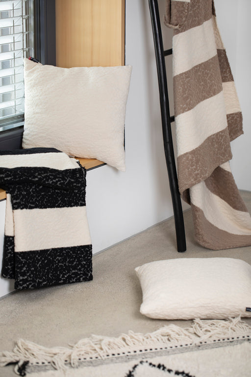 Kuschelig und schön! Die neue Serie Teddy der Firma David Fussenegger. Besonders dekorativ im Blockstreifen-Design in den Farben Schwarz und Nude. ...