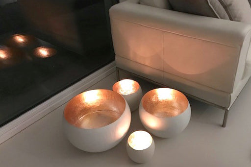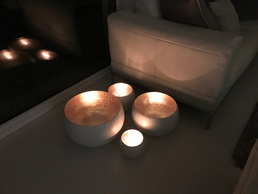 Wunderschönes Windlichtset Madras aus Metall, aussen in weiss matt lackiert und innen mit einer zarten Goldschicht überzogen. Zaubert ein wundersch...